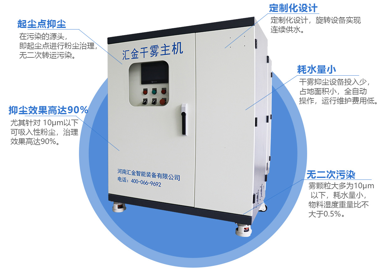 通過水轉(zhuǎn)接裝置/水箱/滑線等,向堆料機(jī)進(jìn)行水/氣輸送,使干霧在堆料機(jī)進(jìn)、出料端形成霧幕,達(dá)到對(duì)1-100μm粉塵的有效抑制。